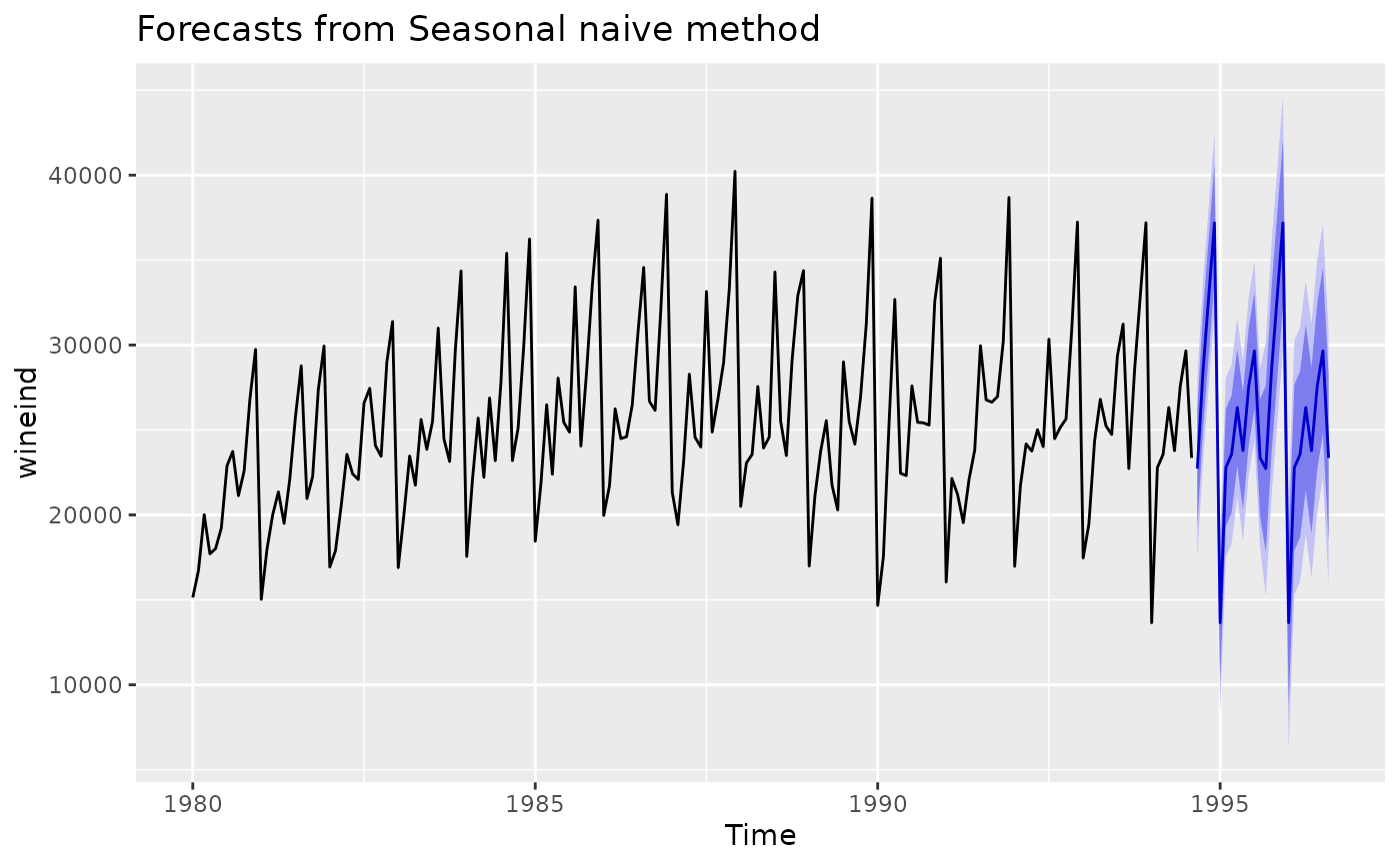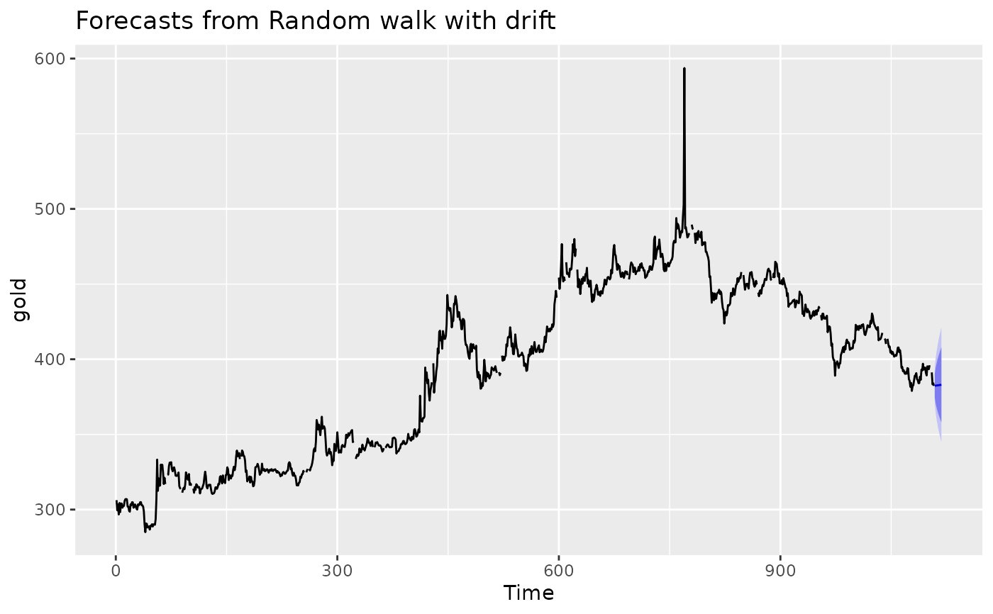 where \(k\) is the integer part of \((h-1)/p\). For a regular random walk, \(p=1\) and \(c=0\), so all forecasts are equal to the last observation. Forecast standard errors allow for uncertainty in estimating the drift parameter (unlike the corresponding forecasts obtained by fitting an ARIMA model directly).