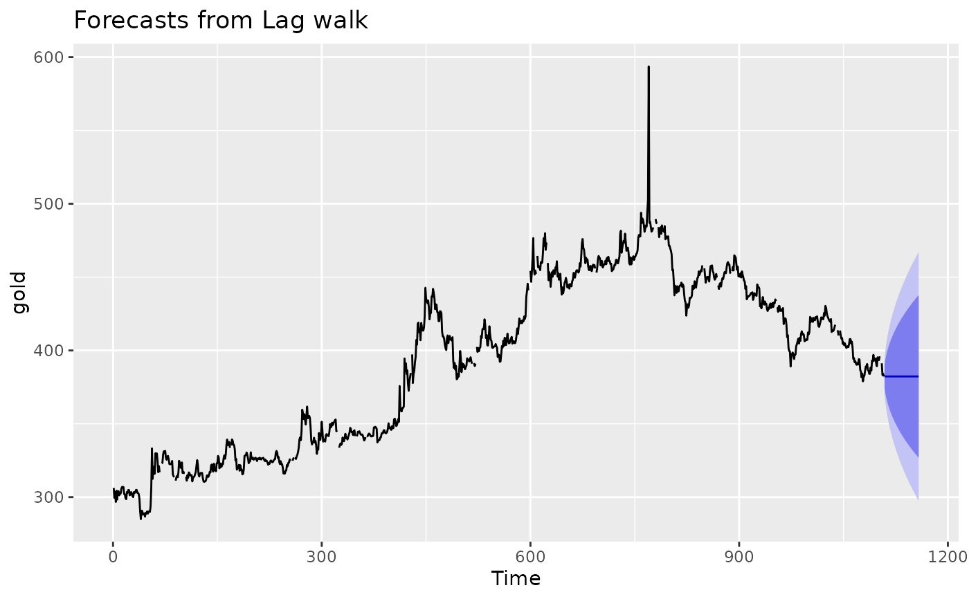where \(k\) is the integer part of \((h-1)/p\). For a regular random walk, \(p=1\) and \(c=0\), so all forecasts are equal to the last observation. Forecast standard errors allow for uncertainty in estimating the drift parameter (unlike the corresponding forecasts obtained by fitting an ARIMA model directly).