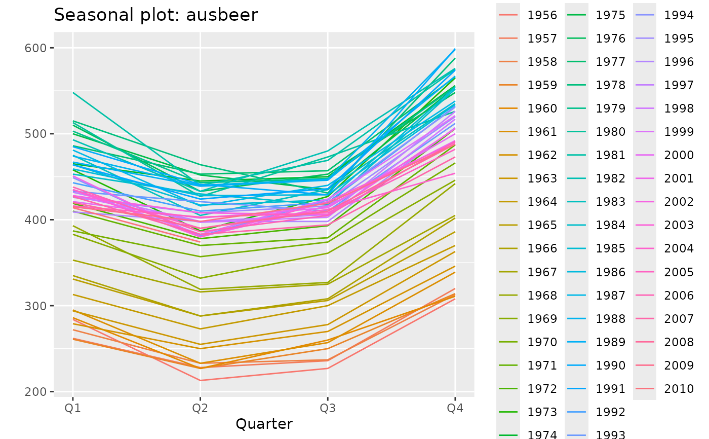 data(ausbeer) ggseasonplot(ausbeer)