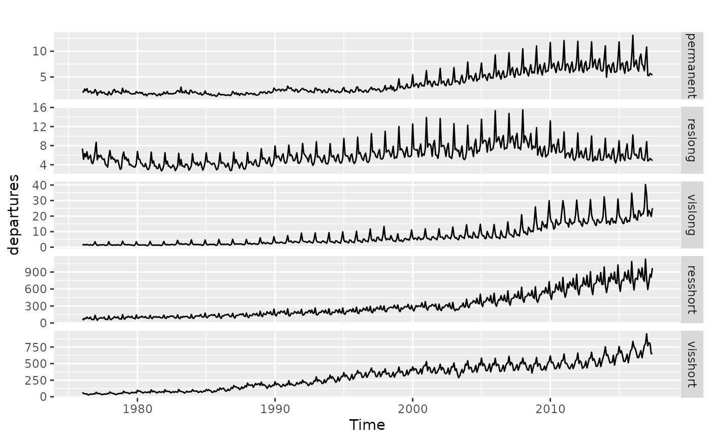 Overseas departures from Australia: permanent departures, long-term (more than one year) residents departing, long-term (more than one year) visitors departing, short-term (less than one year) residents departing and short-term (less than one year) visitors departing. January 1976 - November 2016.