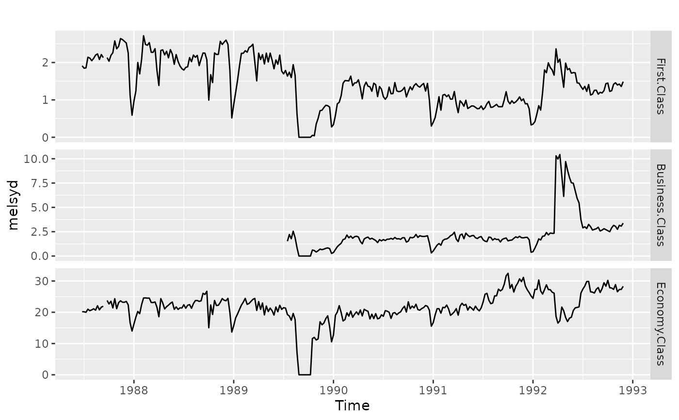 melsyd.RdAir traffic numbers are in thousands, and divided into first class, business class and economy class. There was a major pilots' industrial dispute during the data period resulting in some weeks with zero traffic. There was also at least two changes in the definitions of passenger classes.
