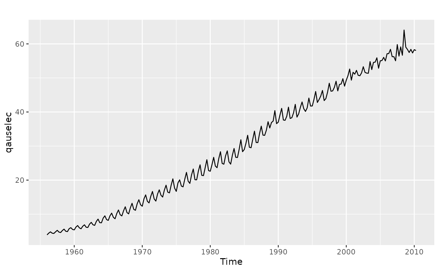 Total quarterly electricity production in Australia (in billion kWh) from 1956:Q1 to 2010:Q2.