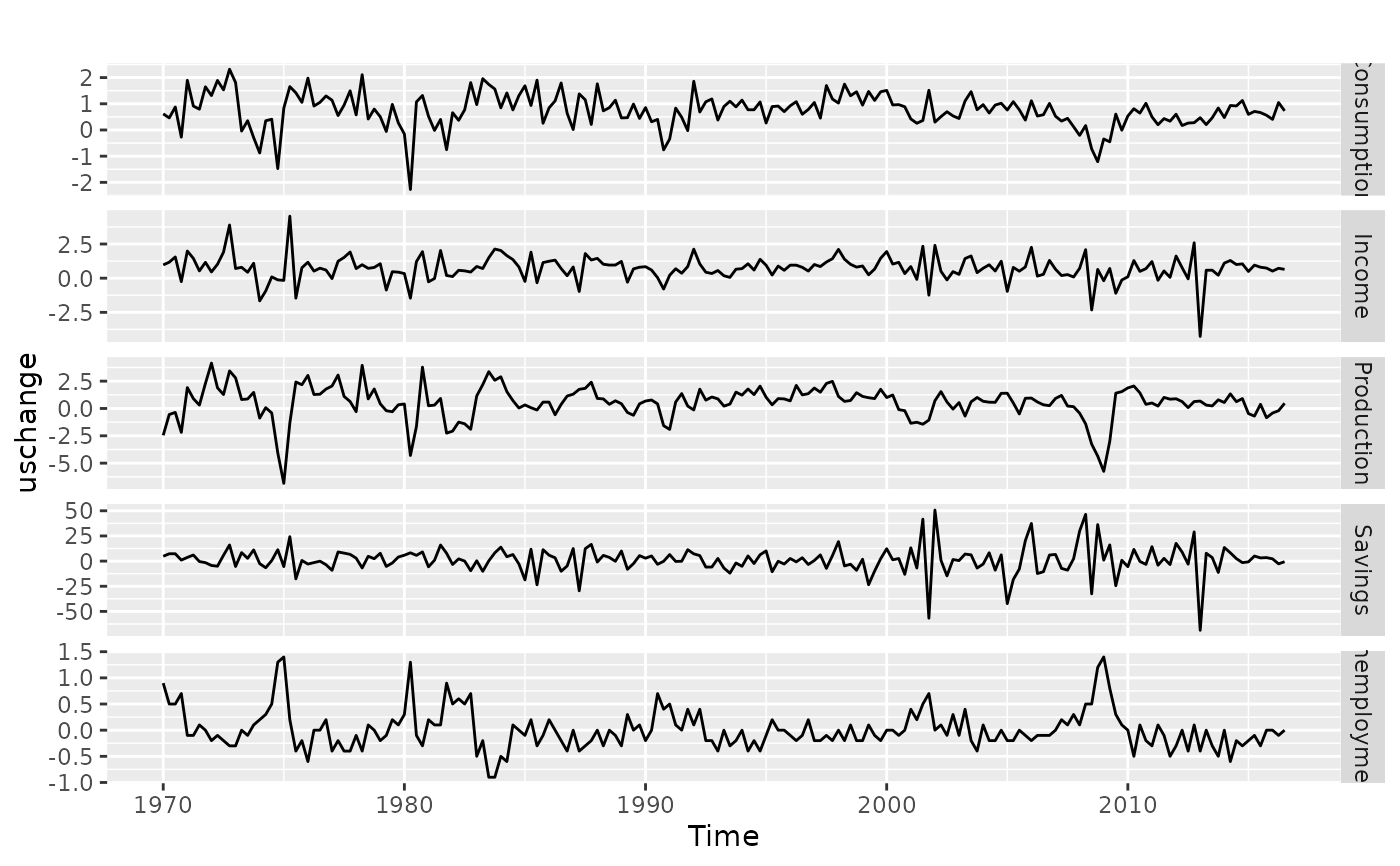 Percentage changes in quarterly personal consumption expenditure, personal disposable income, production, savings and the unemployment rate for the US, 1960 to 2016.